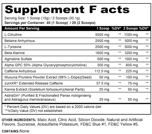 With 11,000mg Citrulline (2 scoops), 5,000mg Betaine, 5,000mg Tyrosine, 600mg Alpha GPC, plus 225mg caffeine + 75mg ZumXR® sustained release, Pandamus Level 2 delivers the perfect blend of pump, power, endurance, and mental sharpness.